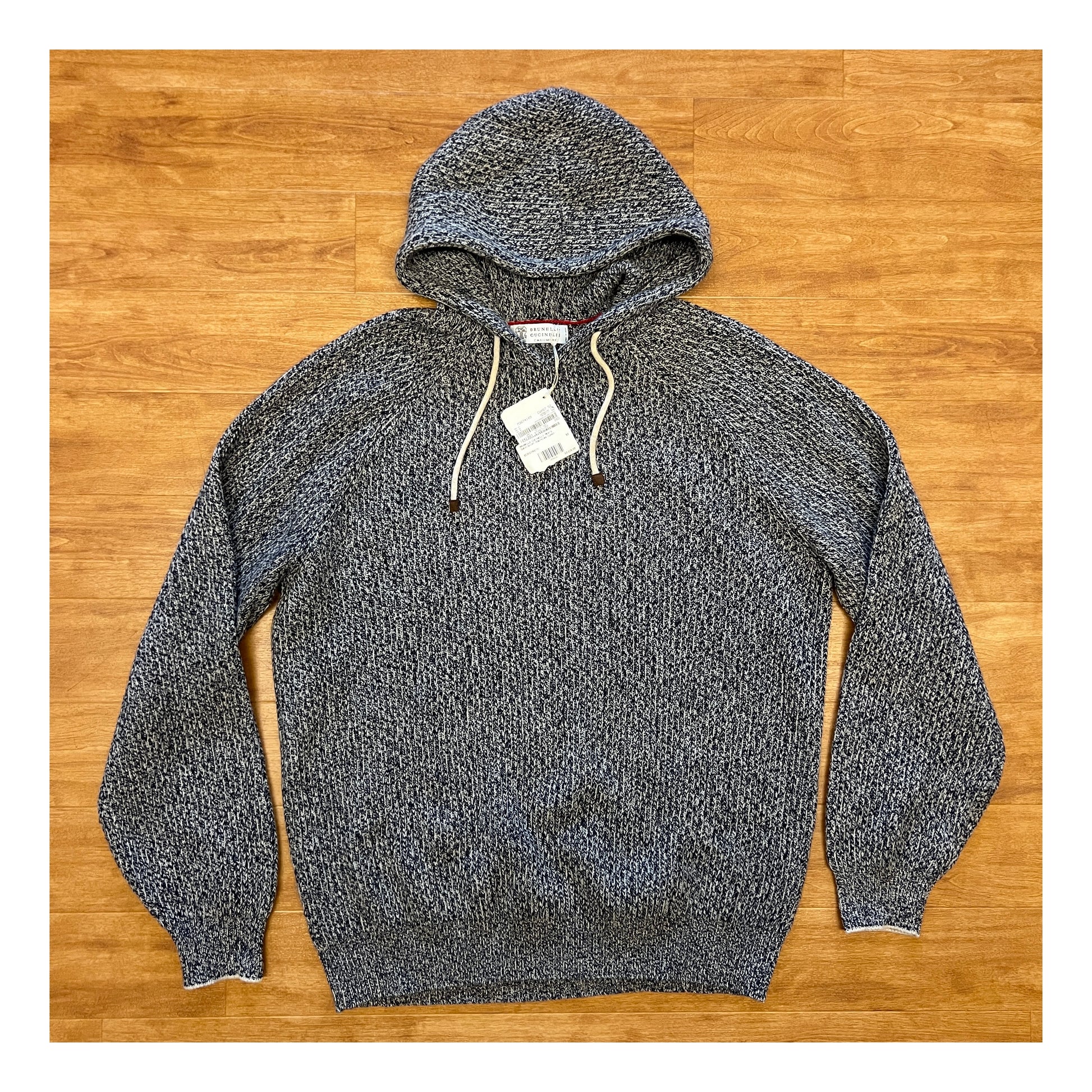 Beautiful hoodie from Brunello Cucinelli, hand knit in Solomeo, Italy from the finest cashmere and virgin wool. Features a drawstring cord with suede tips and elasticated cuffs.