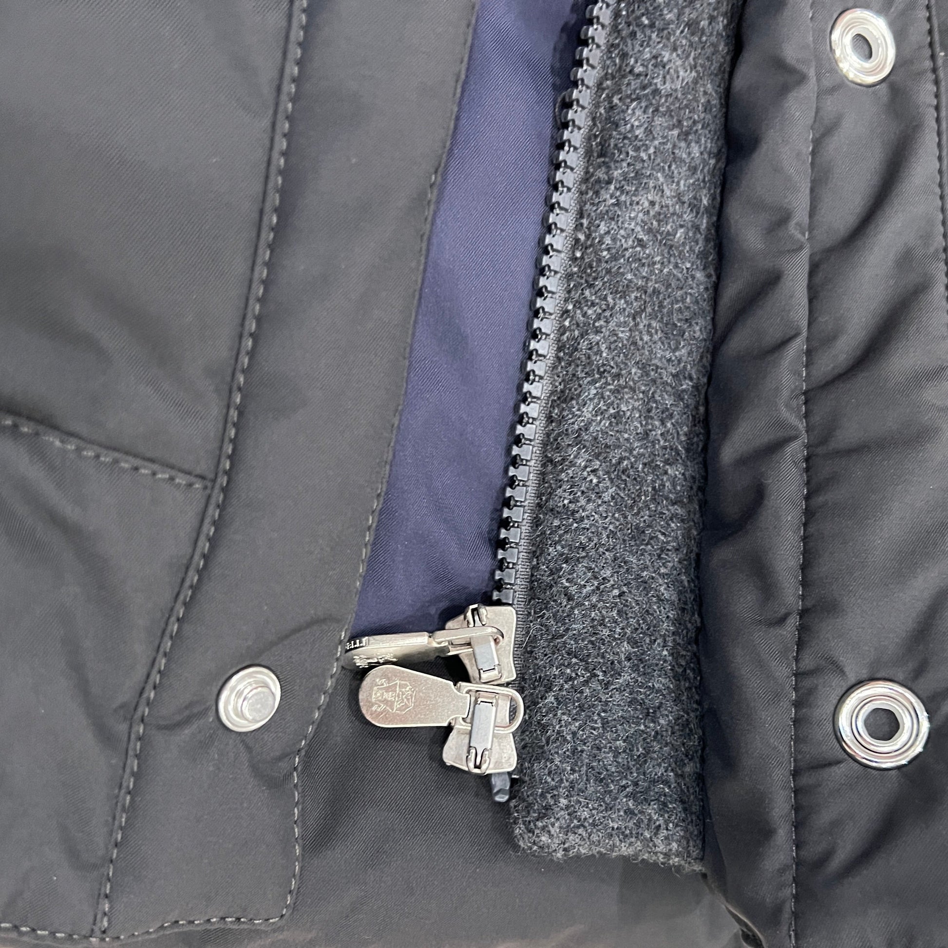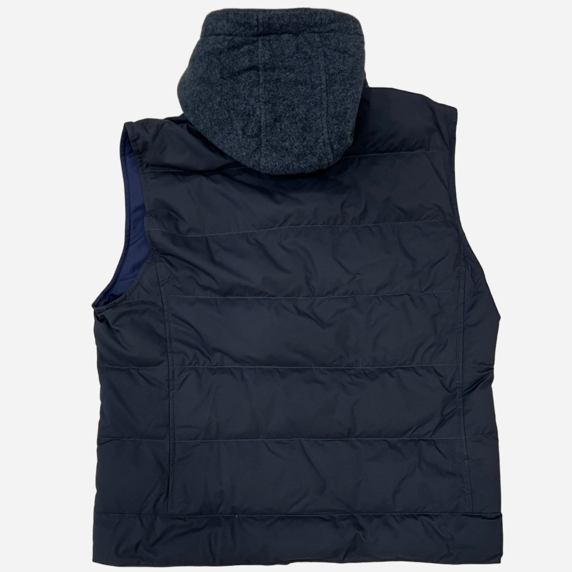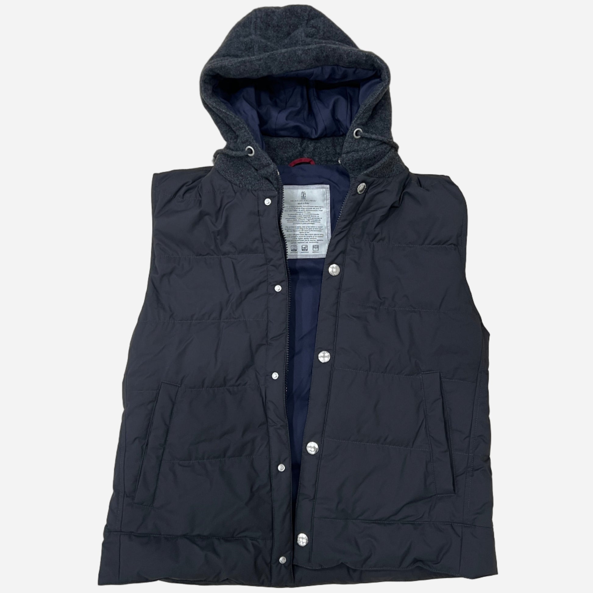 Hooded vest from Brunello Cucinelli, handcrafted in Solomeo, Italy. The torso features a weather resistant fabric with padded insulation, and a cashmere jersey hood in a subtly contrasting grey. Perfect for layering over a sweater or suit this fall / winter season.