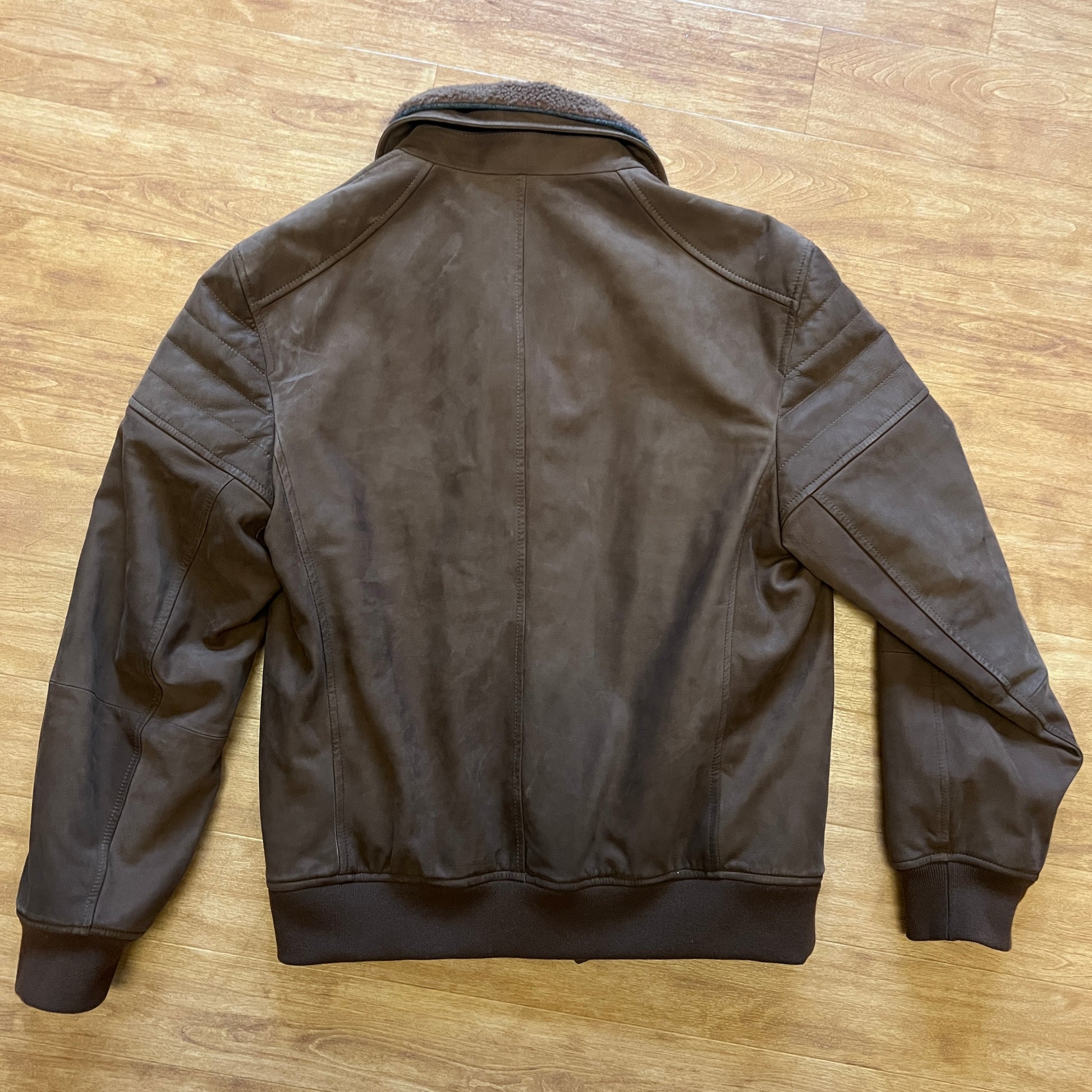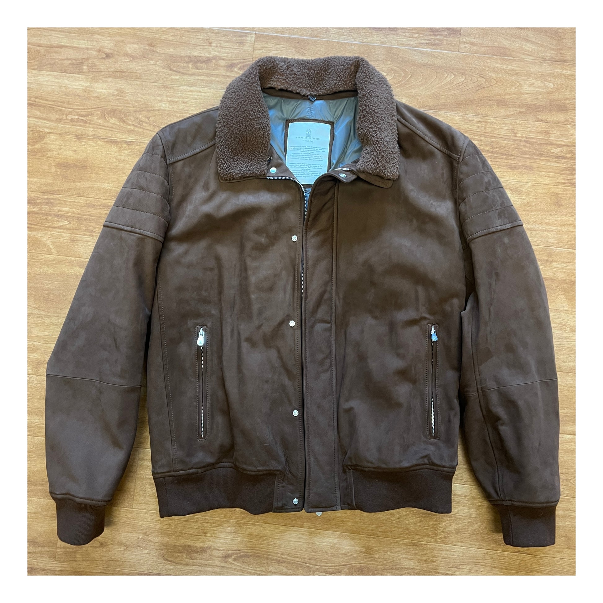Ultra-luxurious bomber jacket from Brunello Cucinelli, handmade in Solomeo, Italy. It features a soft and supple nubuck leather construction with a cozy removable shearling collar.