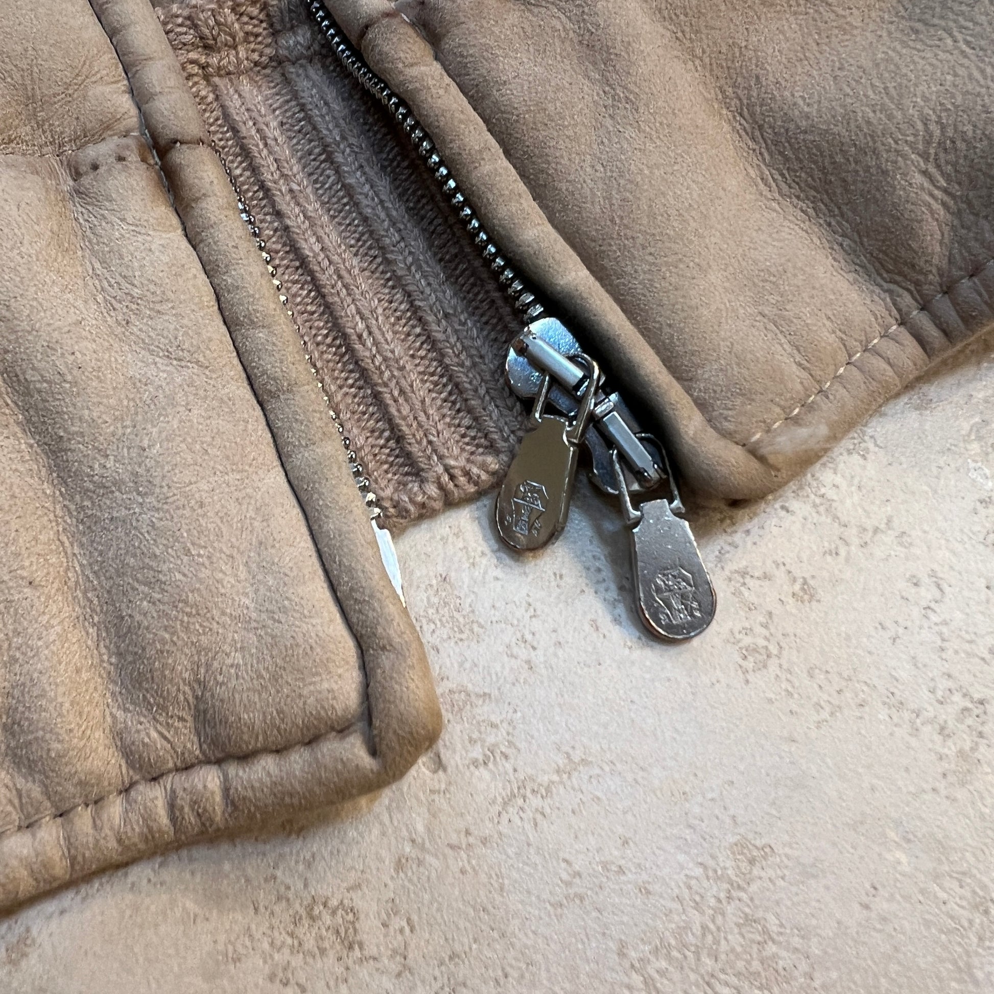 Stunning hooded jacket from Brunello Cucinelli, handmade in Solomeo Italy from the finest sheepskin shearling leather. The elasticated cuffs and waist are knit from soft 100% cashmere, and the zipper pulls are engraved with the Cucinelli crest.