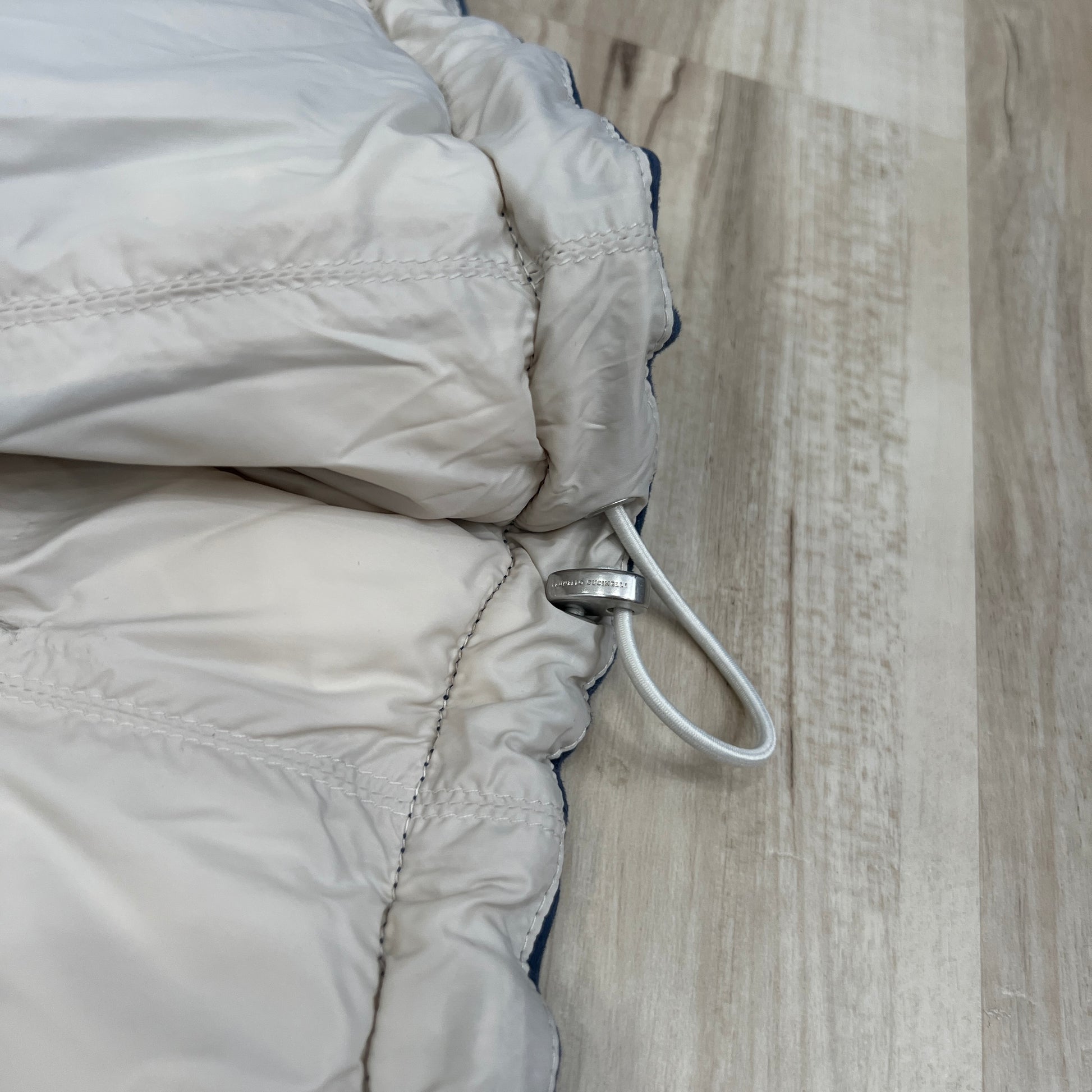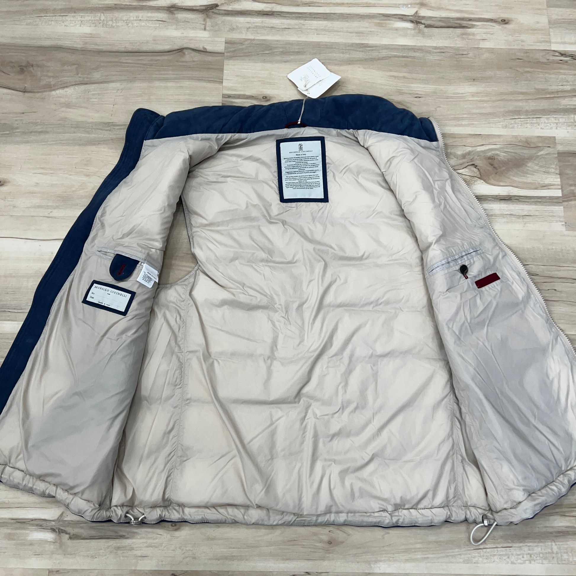 Brunello Cucinelli down-filled puffer vest, handcrafted in Italy from ultra soft blue suede. The two-way zippers are engraved with the brand’s logo, and there is a concealed hood in the collar.