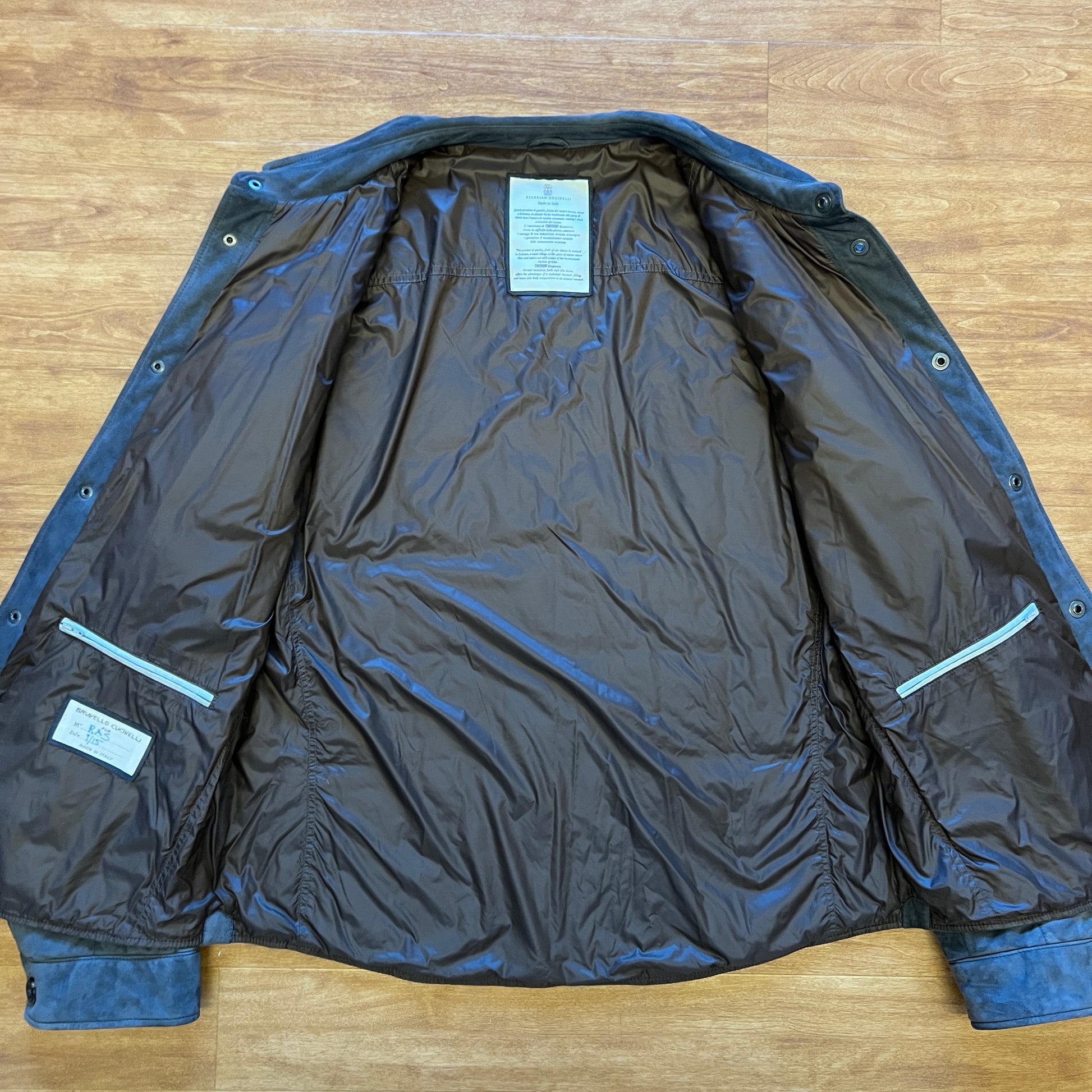 Beautiful suede overshirt jacket with light insulation, handmade by Brunello Cucinelli in Italy. The jacket features snap-button closures made from genuine horn, and is the perfect low-key luxe layering piece for any time of year.