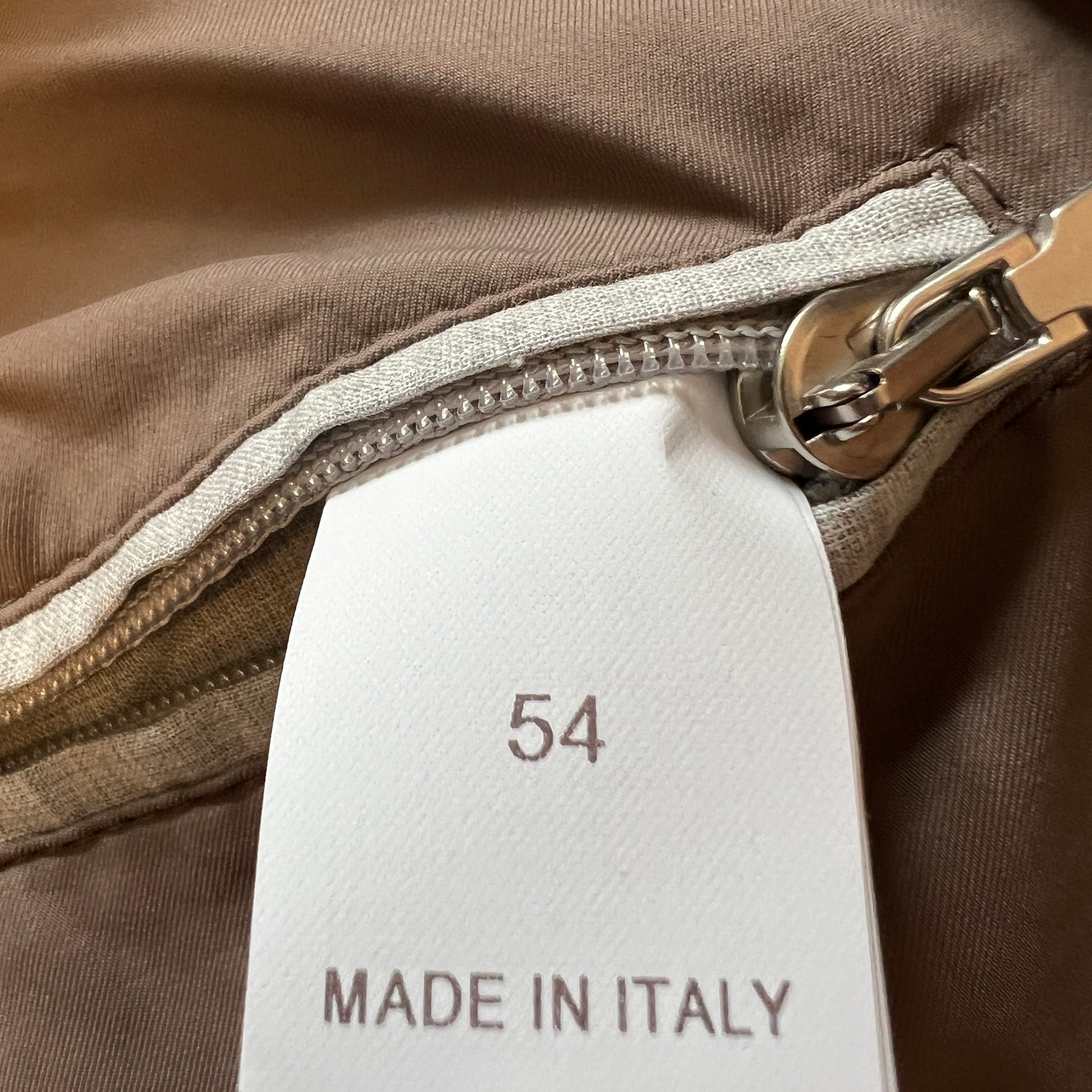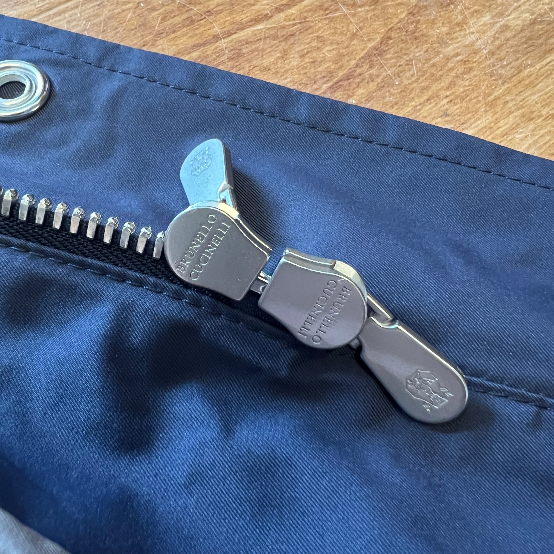 This luxurious coat from Brunello Cucinelli is as functional as it is stylish. It features a zipper and snap closure, a concealed hood, and interior waist adjusters. The fabric is extremely soft to the touch, and is treated for water and wind resistance. This coat can be worn year round, either as a layering piece in the winter or a rain coat in the summer.