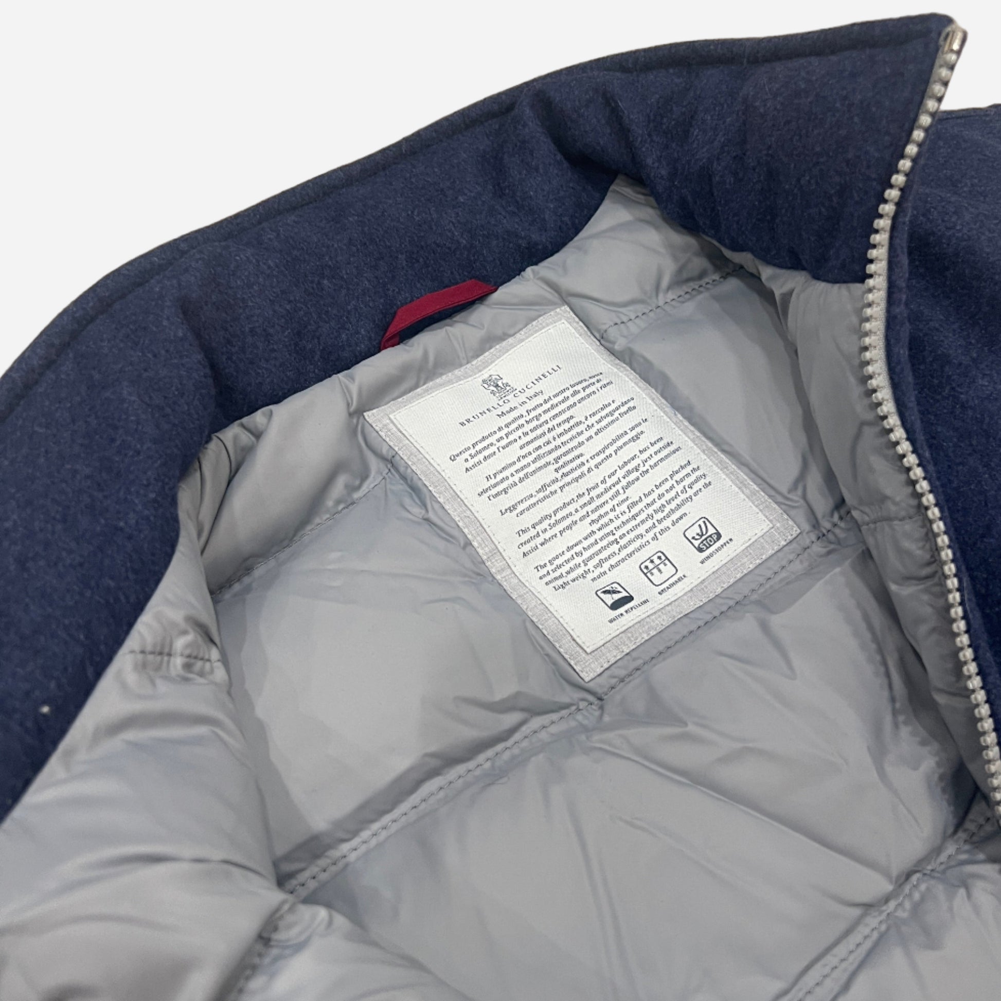 Classic padded vest from Brunello Cucinelli, handcrafted in Italy from a luxe wool jersey. It features a two way zipper and a technical lining for wind and water resistance.