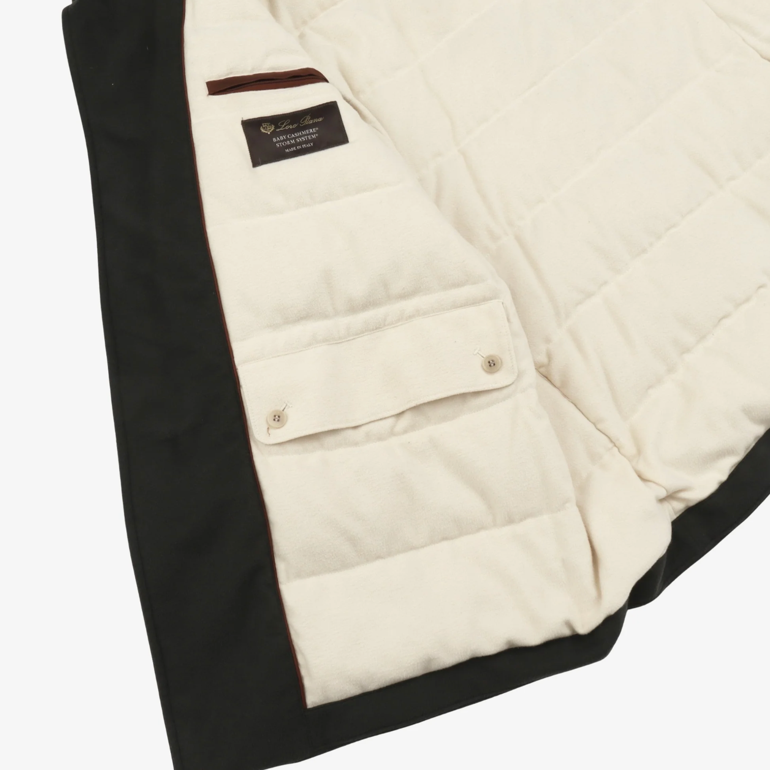 Beautiful heavyweight coat from Loro Piana, handcrafted in Italy from 100% Baby Cashmere. Sheared exclusively from the fleece of newborn cashmere goats, Baby Cashmere is among the softest fibers on earth. It features goose down insulation, full cashmere lining, and a removable Castorino Fur trim at the neck. Castorino Fur is made from hand-selected Argentinian Nutria pelts, which are then plucked and sheared, resulting in an unbelievably soft under-fleece.