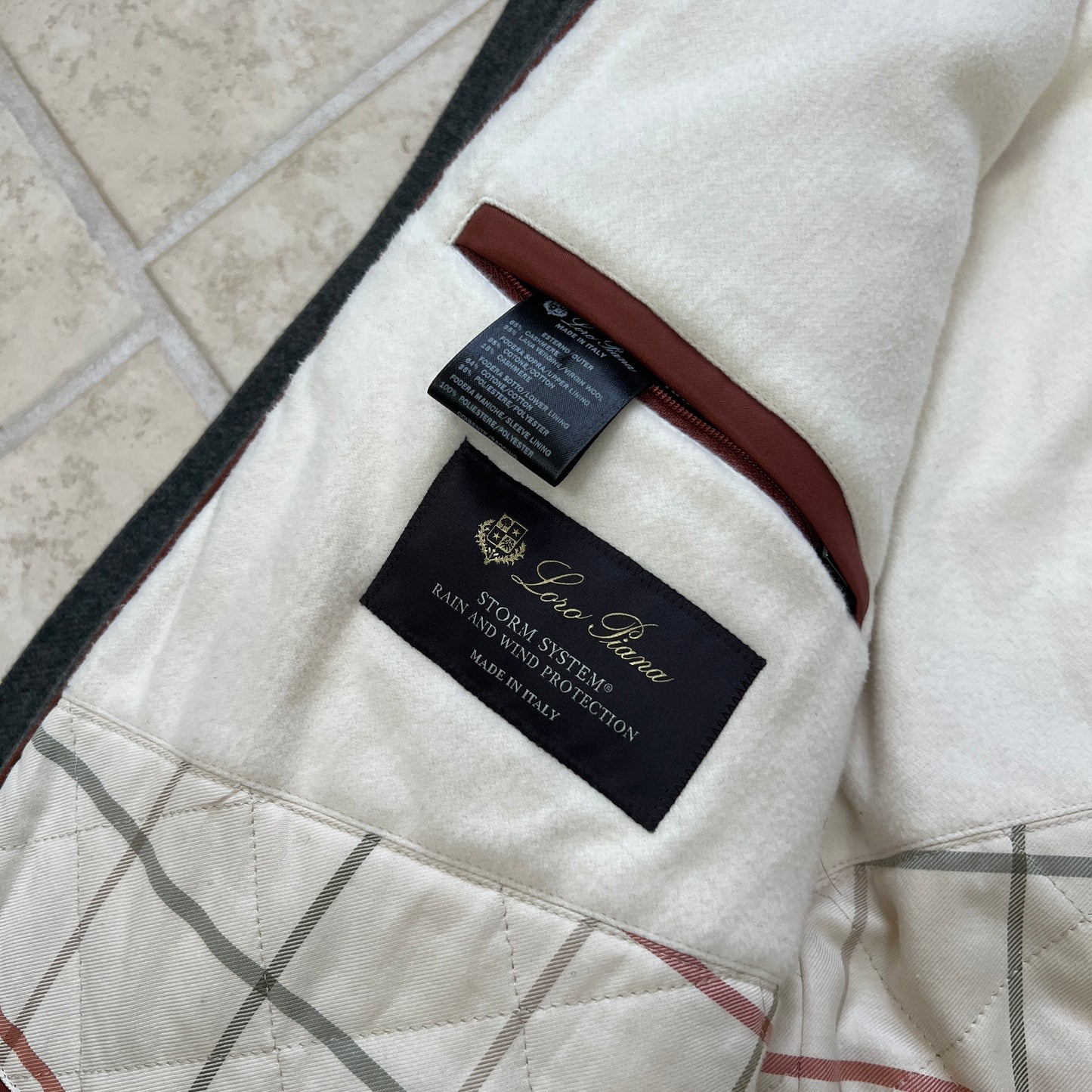 Rare example of Loro Piana’s iconic Traveller coat, featuring heavyweight down insulation for added warmth. The exterior is crafted from a cozy cashmere blend, and the lining is knit from a soft white cashmere. The sleeves feature internal elasticated cuffs, also knit from cashmere.