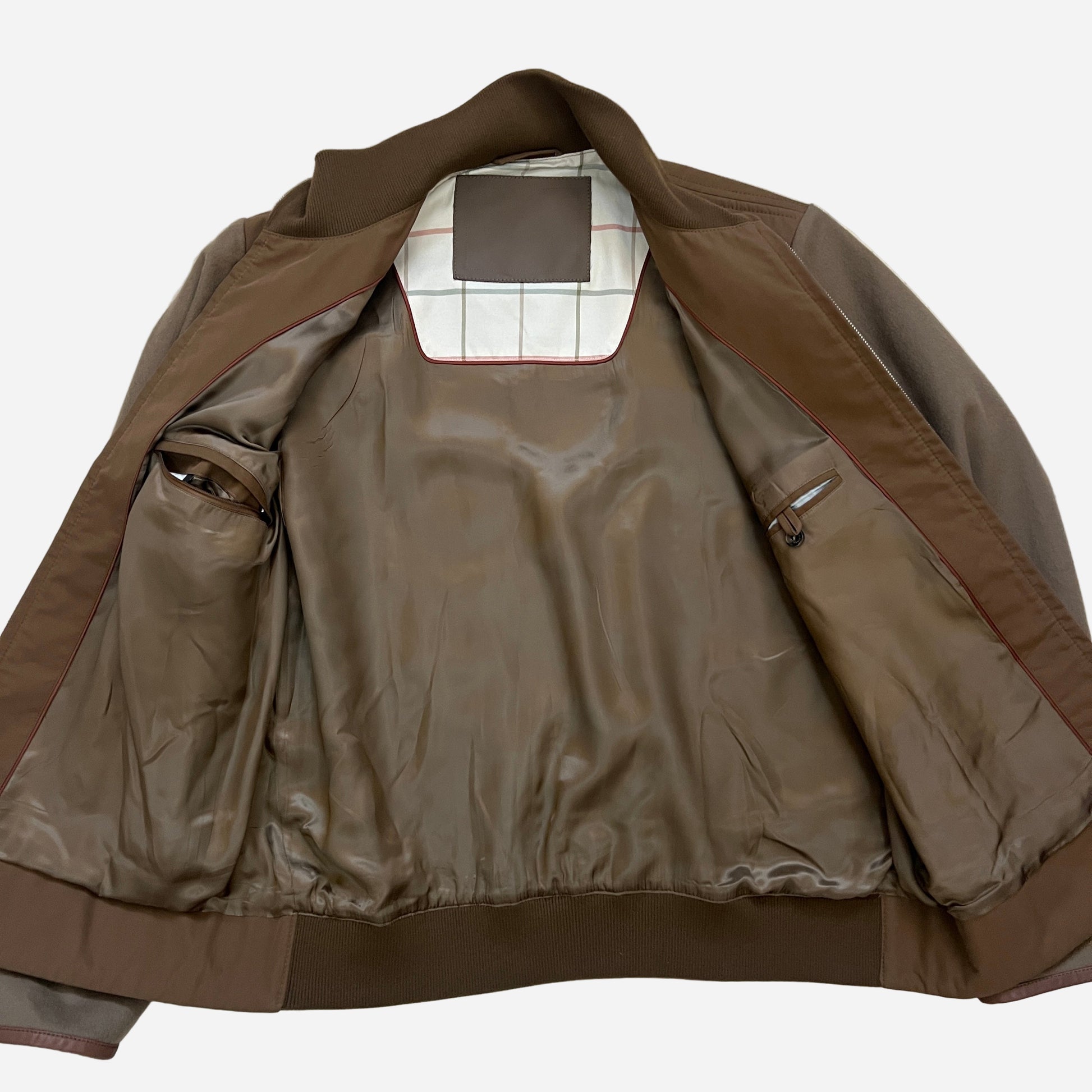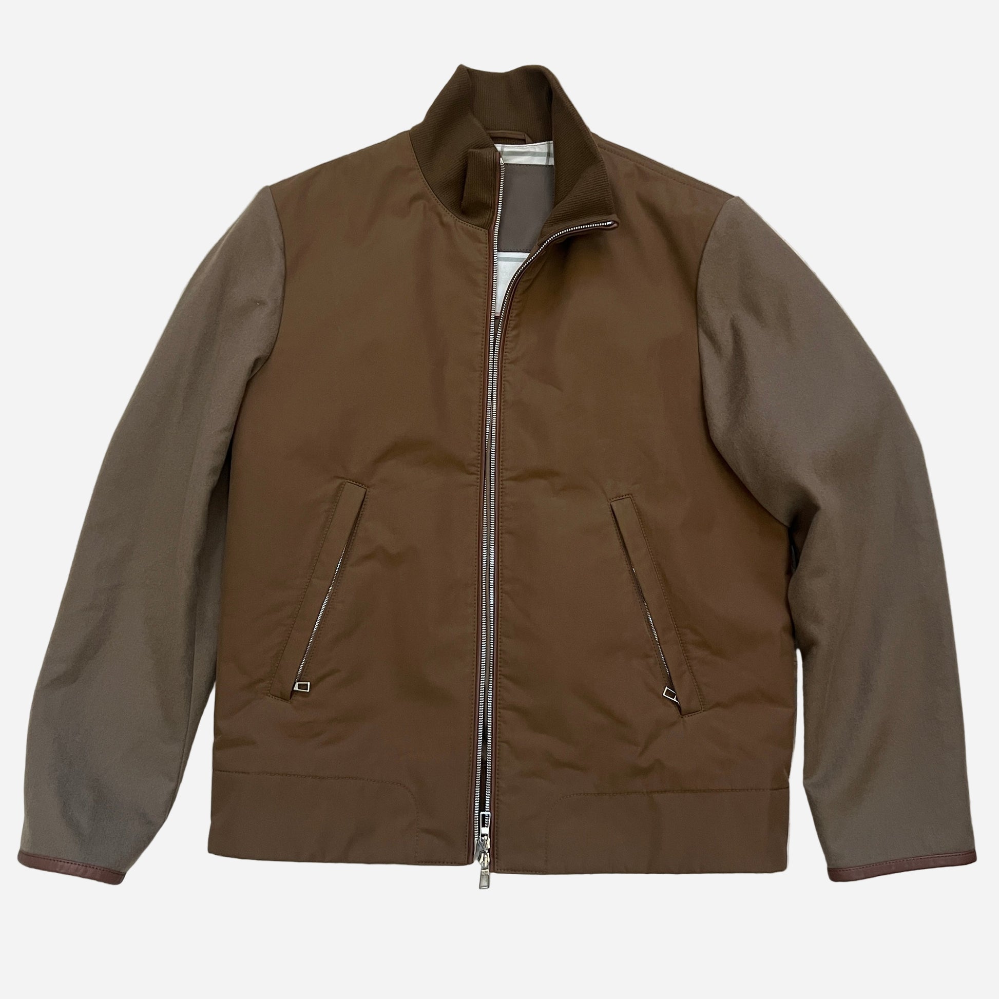 Unique Loro Piana bomber jacket in a hybrid cashmere jersey fabric design. Featuring two-way zippers, ribbed cashmere details, and leather trimming at the seams, this is a super low-key luxe piece for everyday wear. Note that this is a unique sample style and was produced as a one-off design from Loro Piana - see the "2023E PROT" code on the rear side of the tag. As a result it does not have the central Loro Piana logo on the interior, although rest assured this is a 100% authentic Loro Piana piece.
