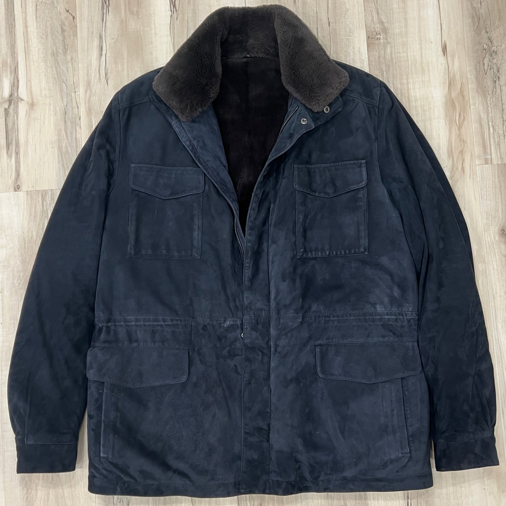 This coat is truly the epitome of ultra luxury. Handmade in Italy from the finest dark blue suede and sheared Castorino fur, it is the peak of Loro Piana’s craft. The deep blue exterior is made from African goat kidskin, and the genuine fur lining is crafted from select Argentinian Castorino fur pelts. The suede combined with the fur results in unparalleled softness and comfort, and is extremely rare.