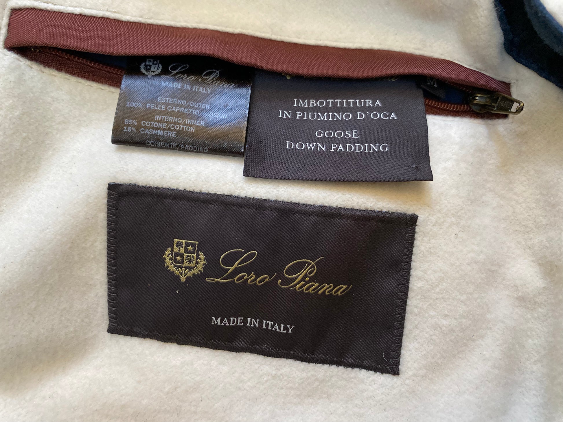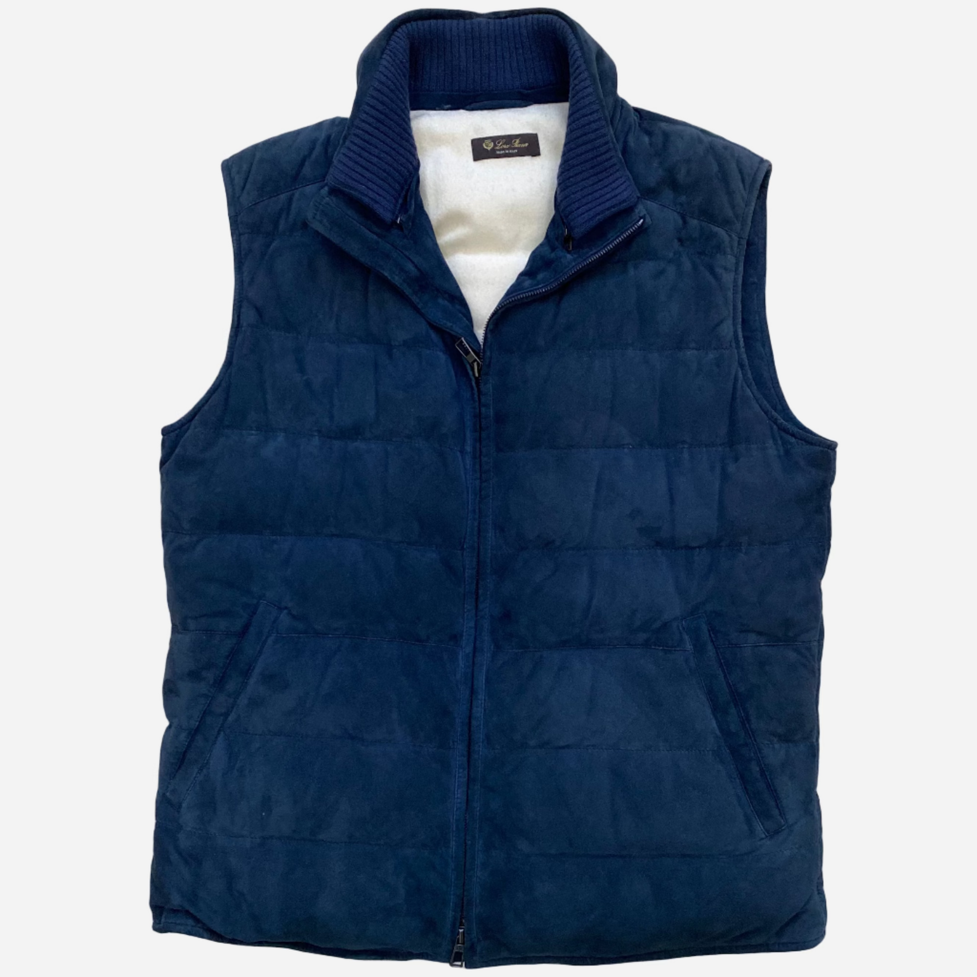 Loro Piana puffer vest handcrafted in Italy from the finest genuine suede. Featuring down padding and a soft cashmere lining, this is the perfect luxe layering piece for the fall/winter season. The removable knit cashmere collar adds an elevated level of warmth, and pockets provide ample storage space for everyday necessities.